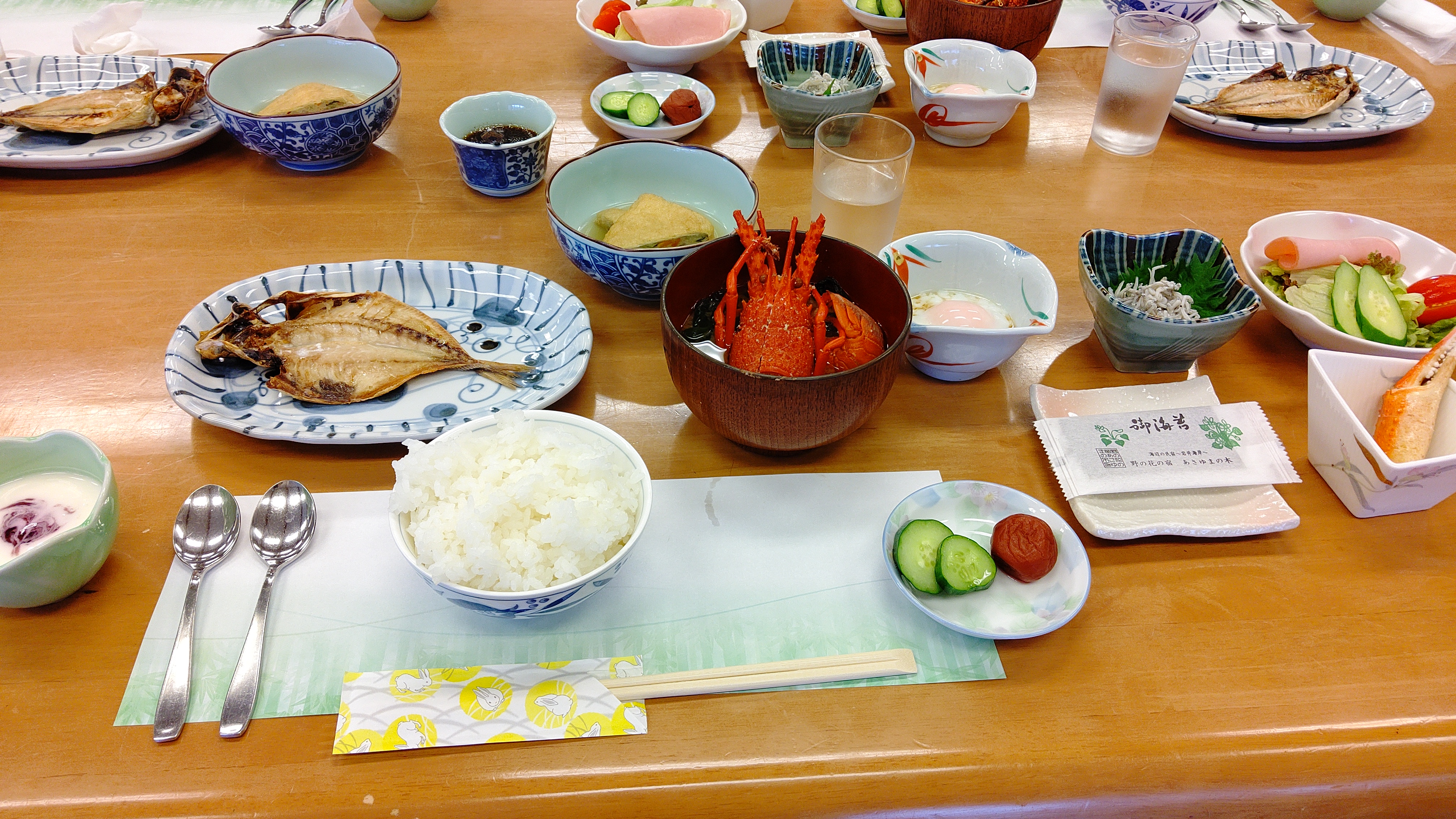 前夜に食べた伊勢海老の味噌汁、デザートのヨーグルト。